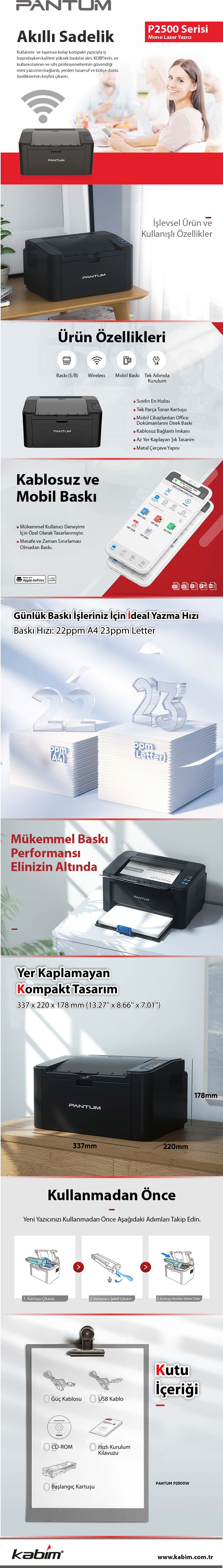 Ürün Özellikleri: Baskı Türü: Siyah-beyaz lazer yazıcı Bağlantı Seçenekleri: Kablolu bağlantı Mobil cihazlarla uyumlu (akıllı telefon ve tabletlerden direkt çıktı alma) Hızlı ve Verimli Baskı: Belgelerinizi hızlı bir şekilde yazdırabilirsiniz. Toner Dolumu: PA 200B toner dolum kiti ile kolay dolum Uzun vadede maliyet tasarrufu sağlayan PA 210EV toner desteği Kompakt Tasarım: Masaüstünde yer tasarrufu sağlar. Kullanıcı Dostu: Hem ev hem de ofis kullanımı için ideal. Avantajları: Hızlı ve ekonomik baskı Mobil cihazlardan direkt çıktı alma özelliği Kolay toner dolumu ve düşük maliyet Kompakt ve şık tasarım Kutu İçeriği: Pantum P2500W yazıcı Kullanım kılavuzu Başlangıç toner kartuşu